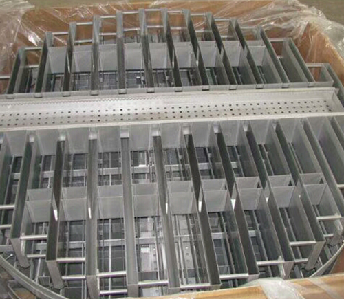 實(shí)現(xiàn)傾斜板對(duì)全截面的覆蓋,能夠?qū)σ后w收集時(shí)提升收集效率,這是柵板式支承-收集-再分布器的最Z大優(yōu)點(diǎn),但是對(duì)于上升氣流的干擾以及高度的增加,會(huì)導(dǎo)致其性能受到一定程度的影響。因此,應(yīng)該采用合理的方式對(duì)柵板式支承-收集-再分布器進(jìn)行改進(jìn)。柵板支承絲網(wǎng)填料的過(guò)程中,液體受到上升氣流的影響,會(huì)通過(guò)塔壁四周流下。這是由于在網(wǎng)片中存在一定程度的毛細(xì)作用,加上上升氣流的上舉力作用,導(dǎo)致液體下落有在困難。為了有效對(duì)液體進(jìn)行收集,需要采取合理的導(dǎo)流措施。為了便于液體分散落入分布槽中,可以將柵板下緣設(shè)計(jì)為鋸齒狀。液體沿內(nèi)壁流下后通過(guò)集液環(huán)由環(huán)形槽收集。多孔型和溢流型柵板式支承-收集-再分布器的設(shè)計(jì),能夠分別在小流量和大流量操作中提升工作效率。